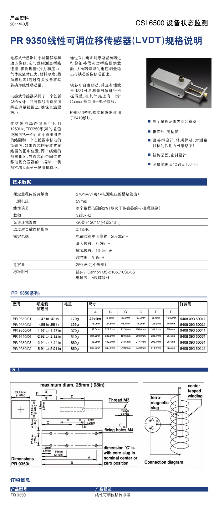 PR9350线性可调位移传感器(LVDT)规格说明书